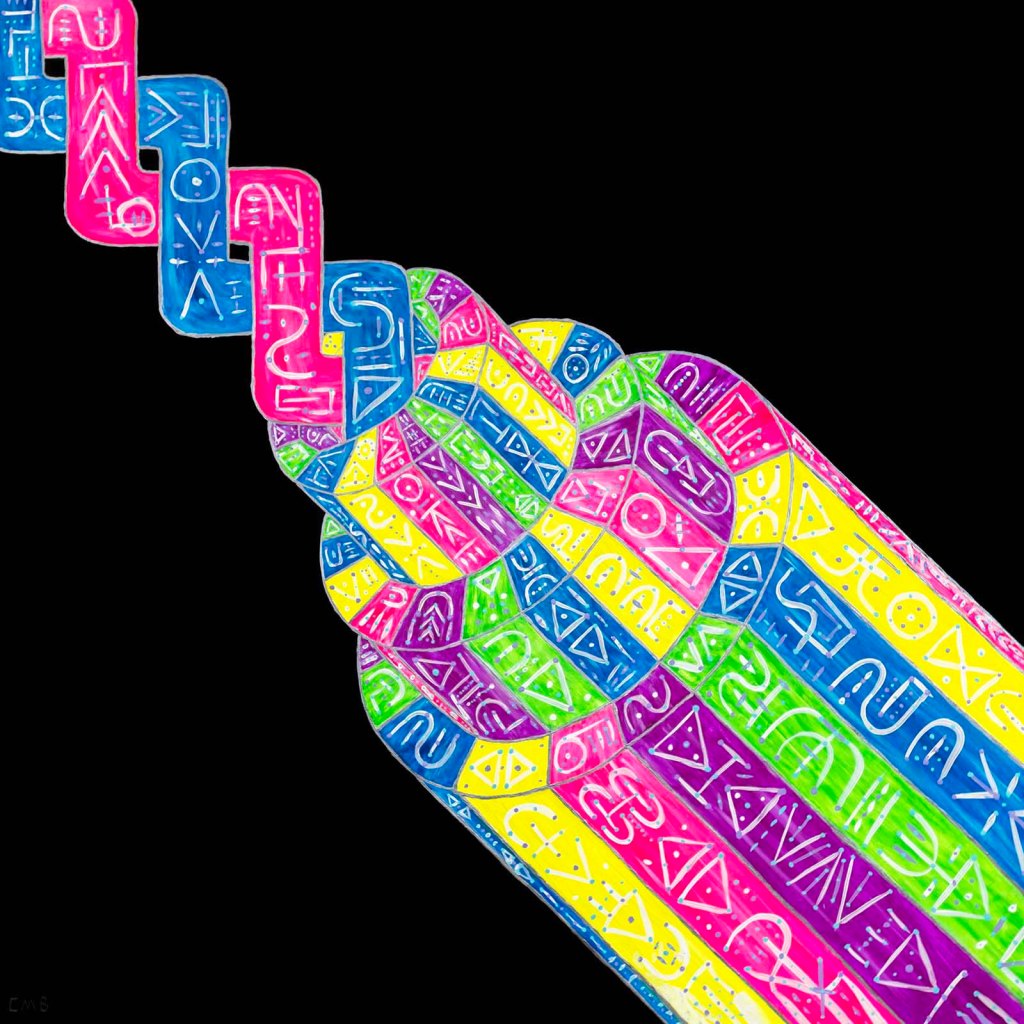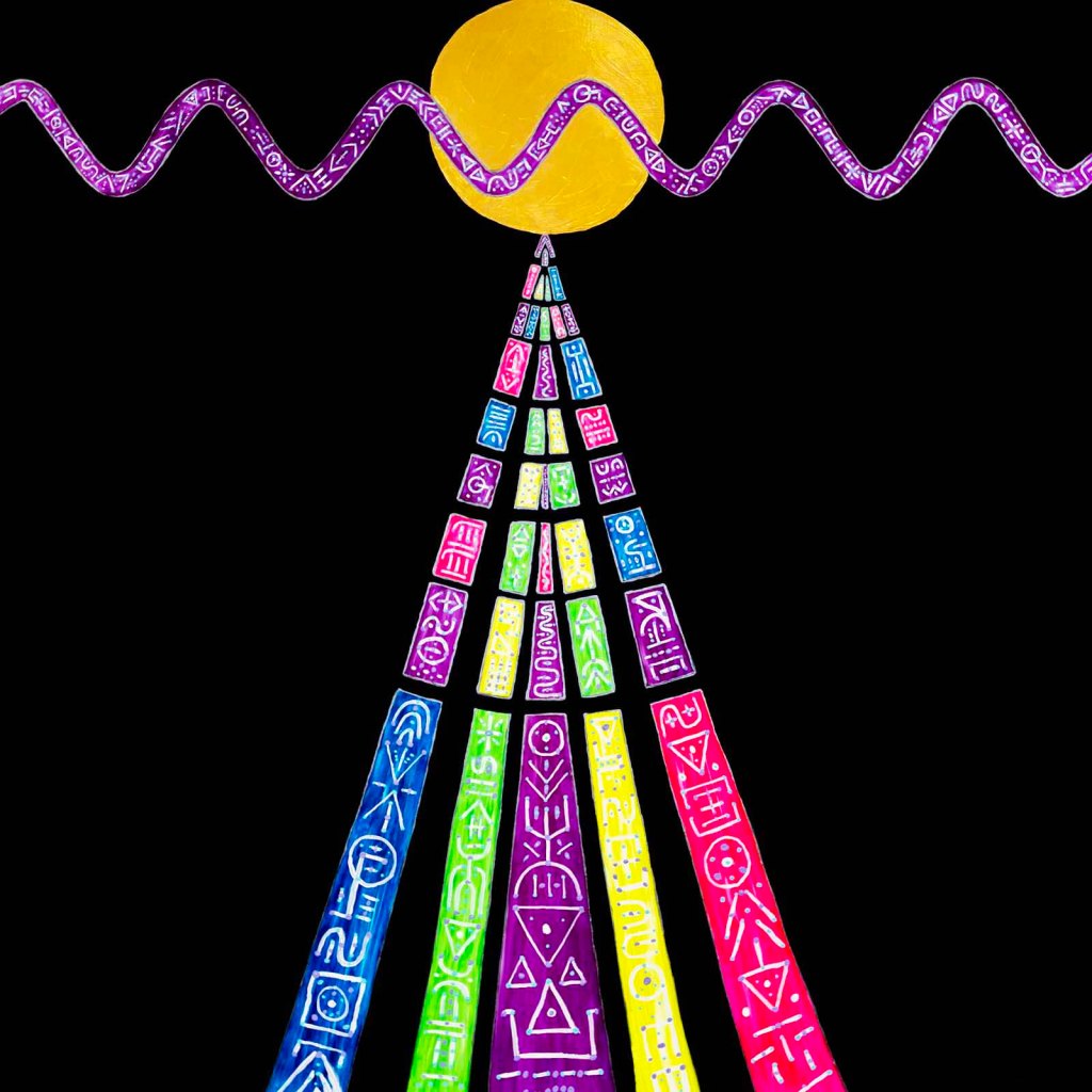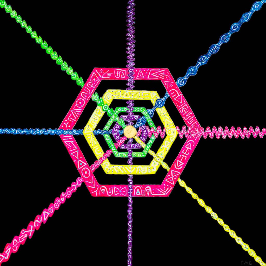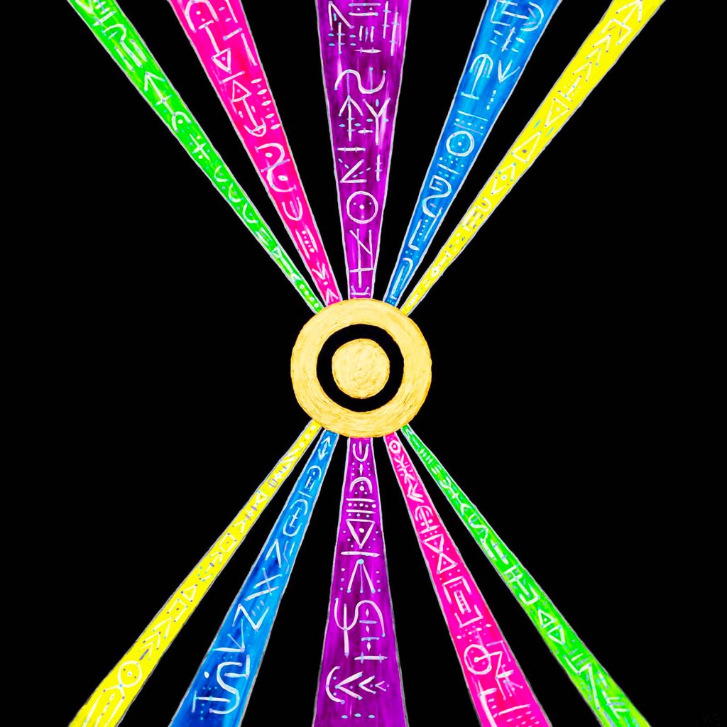 This series is about the point at which we experience our reality and how that reality is constructed through assimilation of data that makes up the universe. The moment of experience can be ever changing, as the data that flows through can be reacted to or responded to in different ways. This can lead to an individual or even humanity as a whole, into a place where the data can be recognized and responded to with intention. By doing this, reality can be changed and altered for the individual, humanity, or the universe. These paintings are all acrylic paint on 48″ x 48″ wood panels.